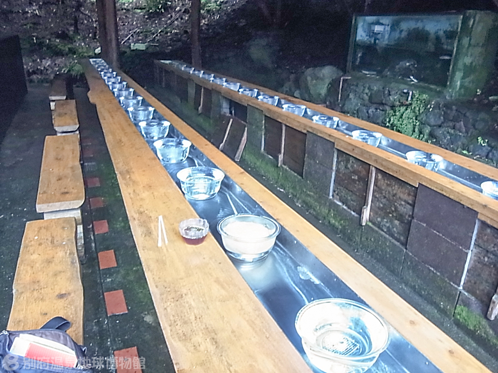 まずは名物の炭酸素麺で腹ごしらえ。贅沢なほどに湧き出す冷泉で冷やされた麺と、自家製のピリッと辛いゆず胡椒が食欲をそそり、たちまちたいらげた。
